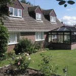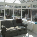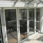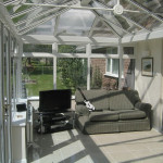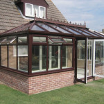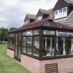 Mr H decided on this Hipped back conservatory with Plaintherm Four Seasons Solar Control Glass in the roof and frames The roof glass has a bronze tint to reduce the sun’s glare and clear glass in the frames to maximise the sunlight. The frames are rosewood on white to match the existing windows and fascias and aluminium bifolding doors have been installed between the living room and conservatory to allow an open feeling of space throughout both rooms.